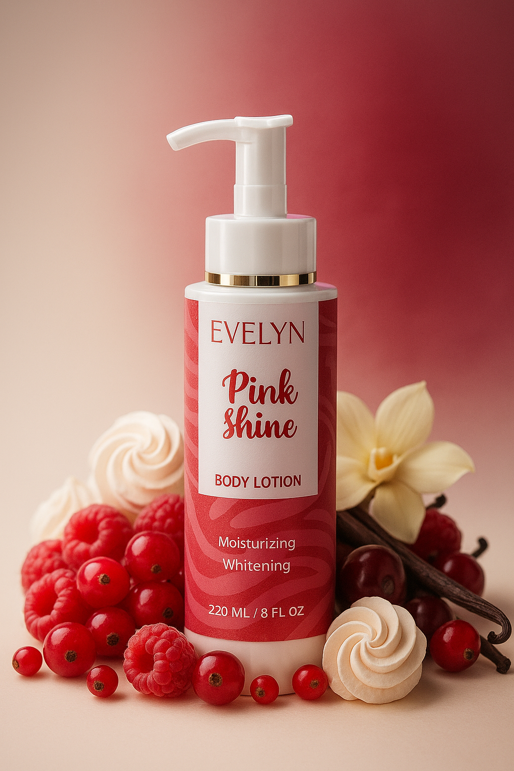 Evelyn Body Lotion – 220ml of Red Berries, Meringue, and Vanilla. Deeply hydrates, refreshes your skin, and offers a sweet, long-lasting fragrance for up to 48 hours.