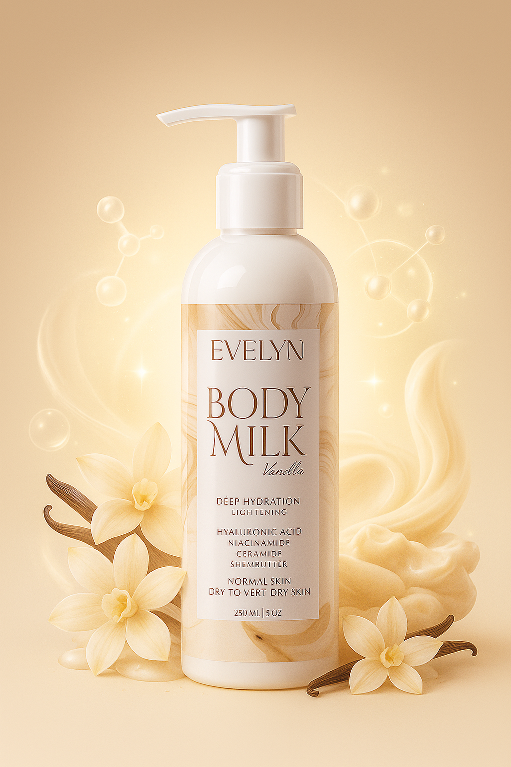 Evelyn Body Milk Vanilla – 250ml. Instant hydration, silky softness, and deep nourishment with Niacinamide, Ceramide, Panthenol & Shea Butter.